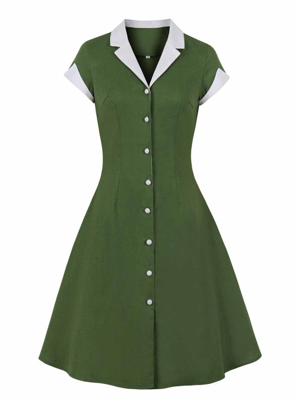 1950er Festes Farbe Patchwork Revers Knopfkleid