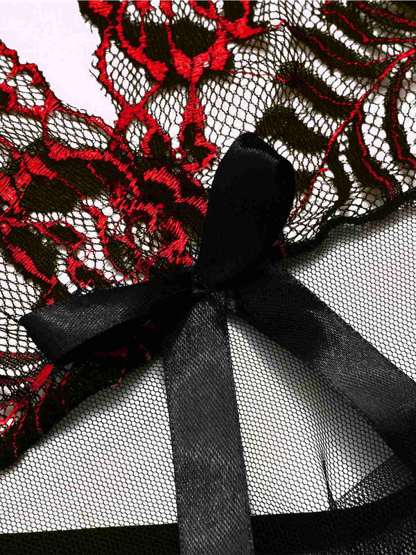 Schwarz 1950er Schnürung Halter Besticktes Sheer Nachthemd
