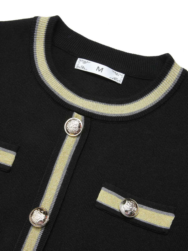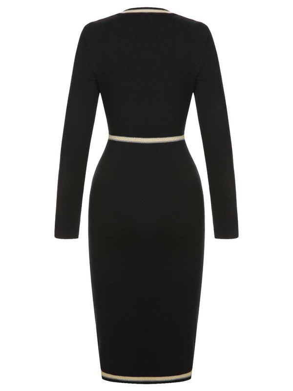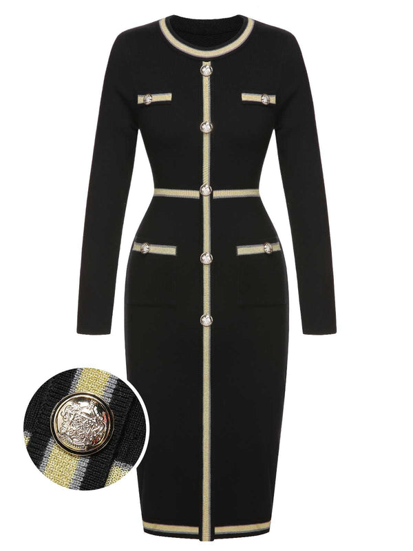 Schwarz 1960er Gestricktes Knöpfen Patchwork Kleid