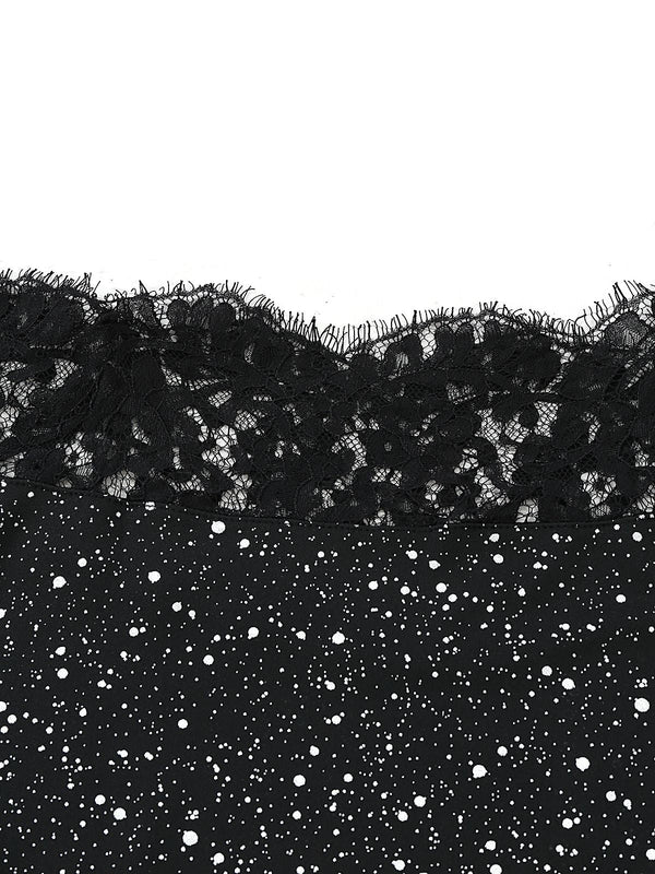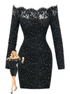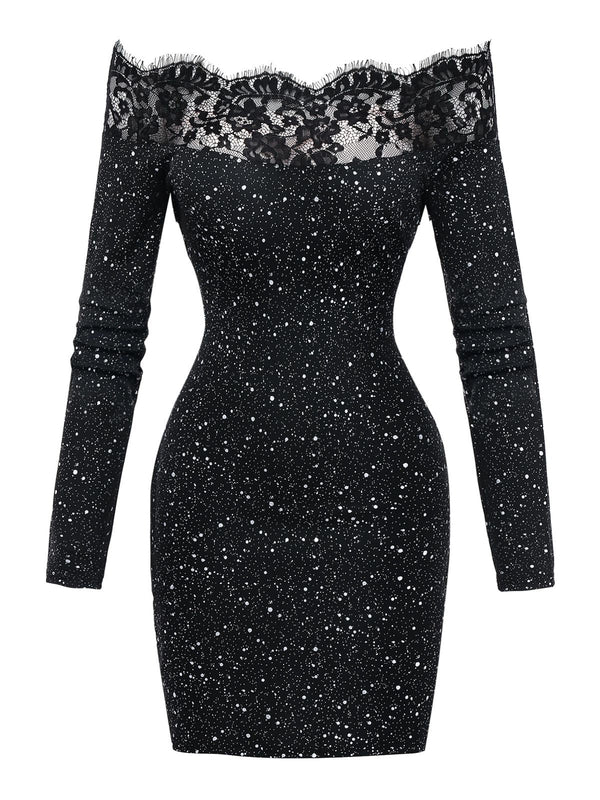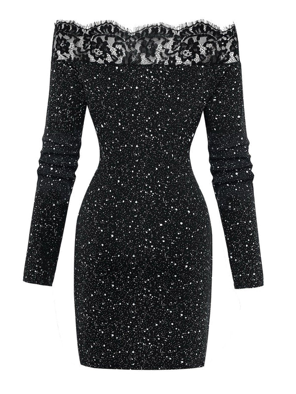 Schwarz 1980er Spitze Schulterfrei Silber Spritzer Enges Kleid