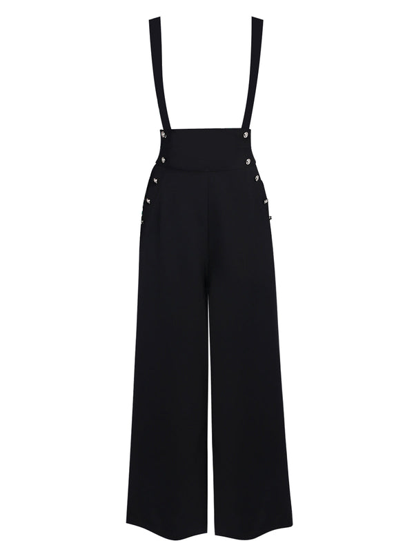 Für kühne Abenteuer, meine Damen! Diese sensationelle Hosenträgerhose ist ein fabelhaftes Retro-Basic in einem soliden Schwarz und aus einem leichten Webstoff gefertigt, um Ihr Ensemble luftig zu ergänzen. Die hohe, gebänderte Taille ist mit Knöpfen befestigt, während die klassischen Hosenträger mit Knöpfen befestigt und für vielseitigen Tragekomfort leicht abnehmbar sind, während sie für eine schmeichelnde Passform leicht angepasst werden können.
