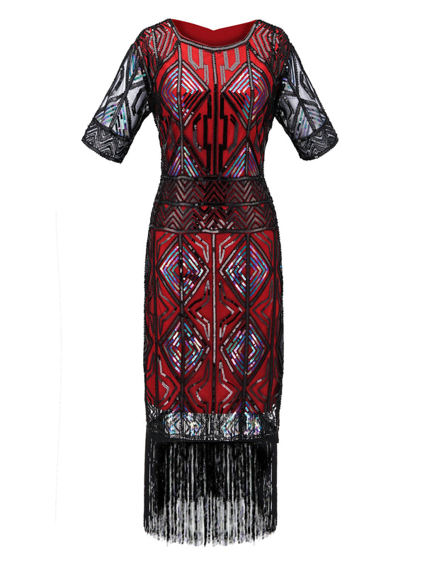 WEINROT 1920ER HALBE ÄRMEL PAILLETTEN FRANSEN KLEID