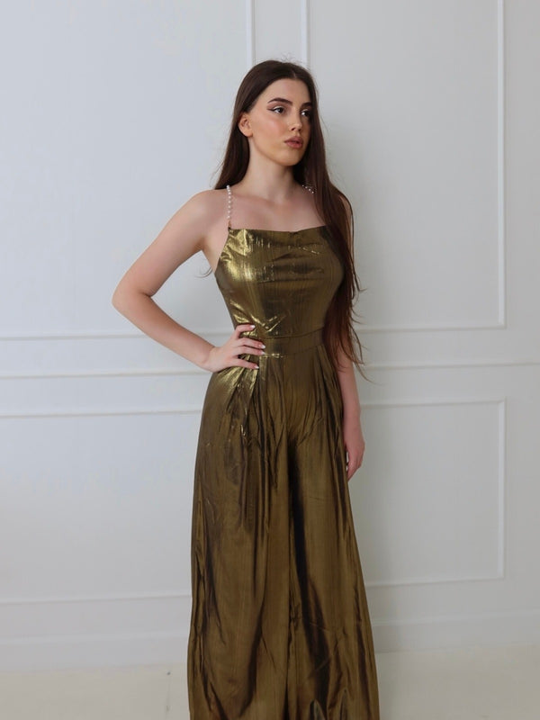 Disco outfit Metallic Gold 1980er Wasserfallkragen Spaghetti Träger Jumpsuit