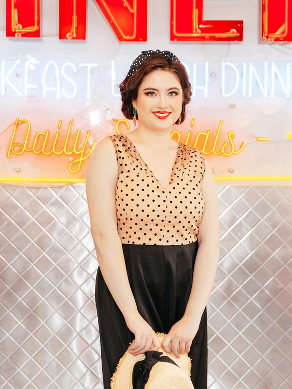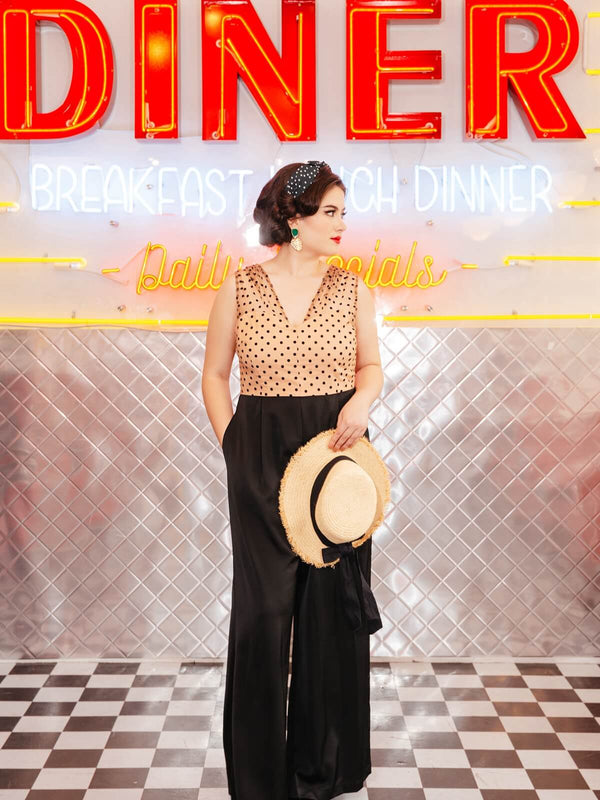 Brauchen Sie noch ein paar Tupfen, Mädels? Der Jumpsuit verfügt über einen schönen Punktdruck vor einem schwarzen Hintergrund, der in einen wunderbaren, dehnbaren Stoff gegossen ist. Mit einem Jumpsuit dieser besonderen Art wissen Sie einfach, dass Sie auf Ihrer Party, Ihrem Abschlussball oder Ihrer Teeparty eine Million Dollar sehen werden.