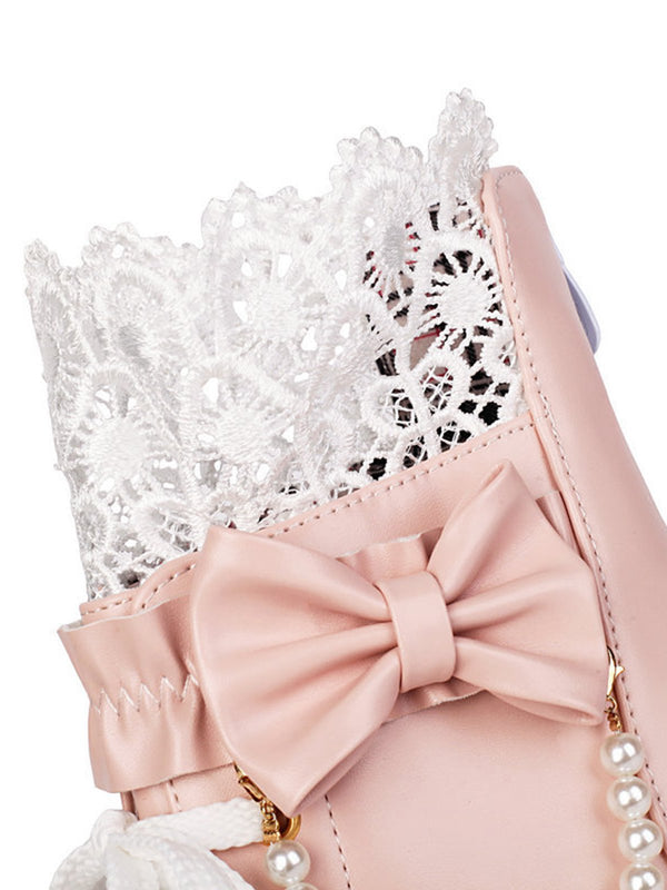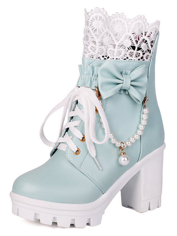 Vintage Spitze Perlen Bogen Blockabsatz Stiefel