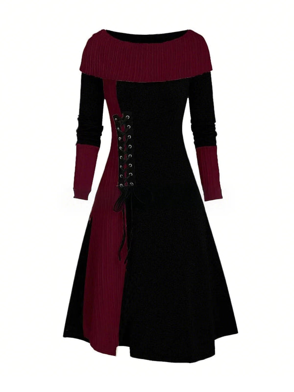 1940er Schnürung Farbblock Schulterfrei Kleid