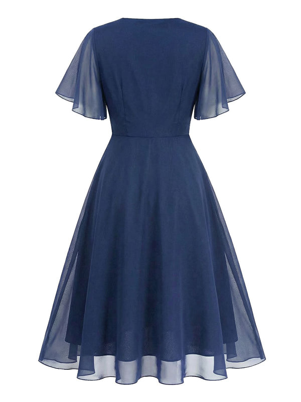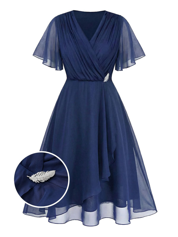 [Vorverkauf] [Übergröße] Marineblau 1940s Brosche Chiffon Wickel Kleid