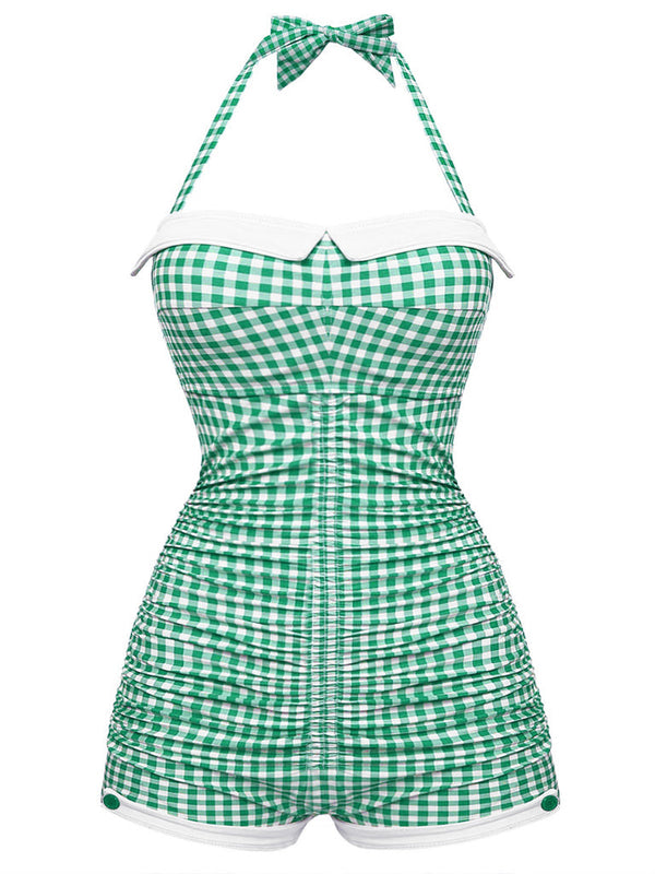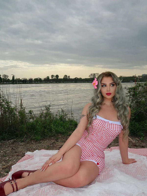 Dies ist Audrey Hepburns Lieblings-Vichy-Plaid-Print. Vintage-Badeanzüge sind der perfekte Weg, um die Retro-Ära im Sommer nachzuahmen. Basierend auf dem weißen Hintergrund werden horizontale und vertikale Streifen der gleichen Farbe und der gleichen Dicke in gleichem Abstand übereinander gelegt, und die Farbe wird dort dunkler, wo sie übereinander liegen, was der Retro-Bademode auch ein Gefühl von Layering im eleganten französischen Stil verleiht. Kennt noch jemand das Geheimnis, dass ein Karomuster Sie auf 18 zurückbringen kann? Sieht jung und schön aus! Einteilige Badeanzüge können auch Bauchfett verbergen. Ob in den 1920er, 1950er oder 1960er Jahren, Karos sind die Magie der Mode.
