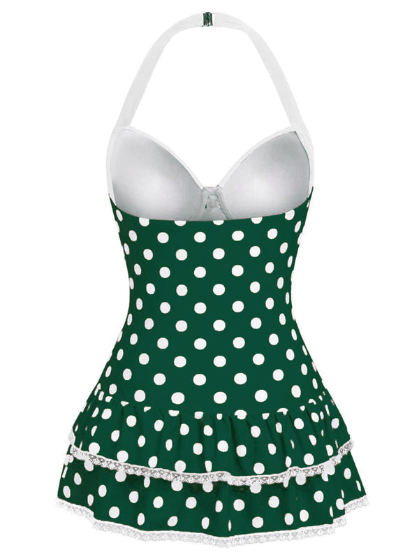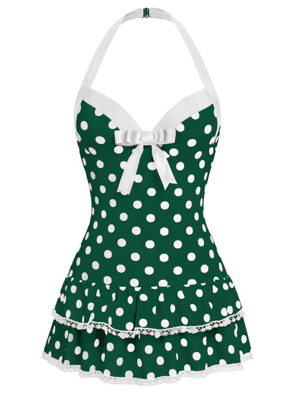 Verleihen Sie Ihrem Sommerlook mit dem rosa Einteiler-Badeanzug mit Neckholder, Polka-Dots und Schleife aus den 1940er Jahren von Retro Stage das gewisse Etwas. Mit seinem bezaubernden rosa Stoff und den klassischen schwarzen Polka-Dots verkörpert dieser Badeanzug die Essenz vintage Eleganz.