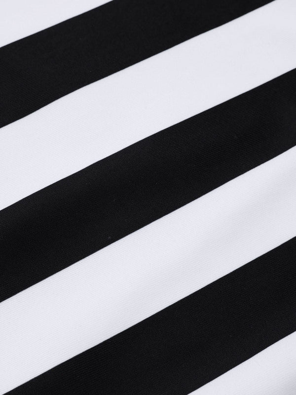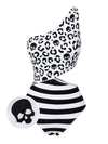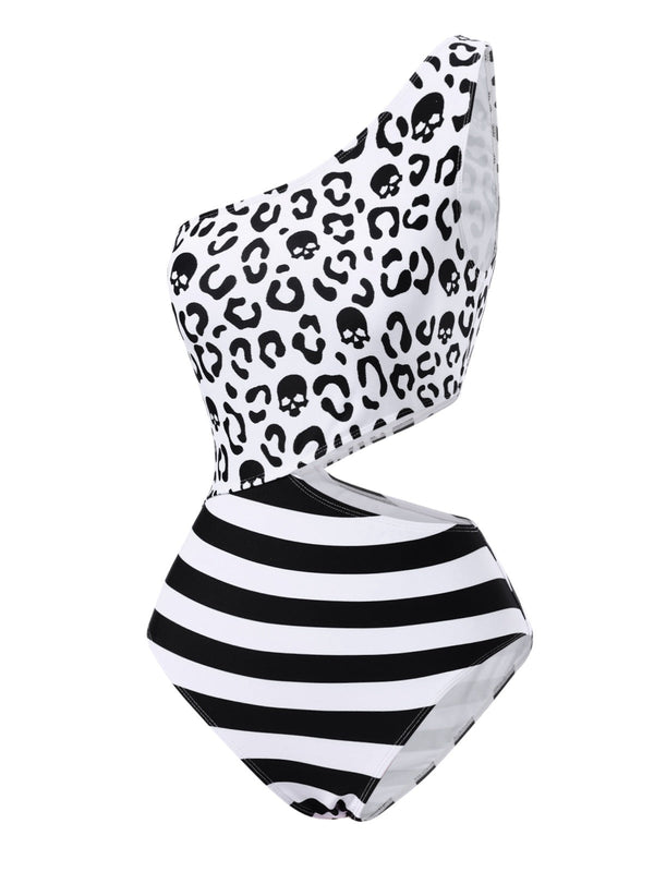 Schwarz 1980er Eine Schulter Hohl Skull Streifen Badeanzug