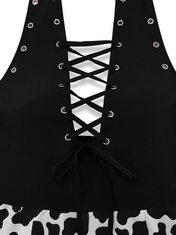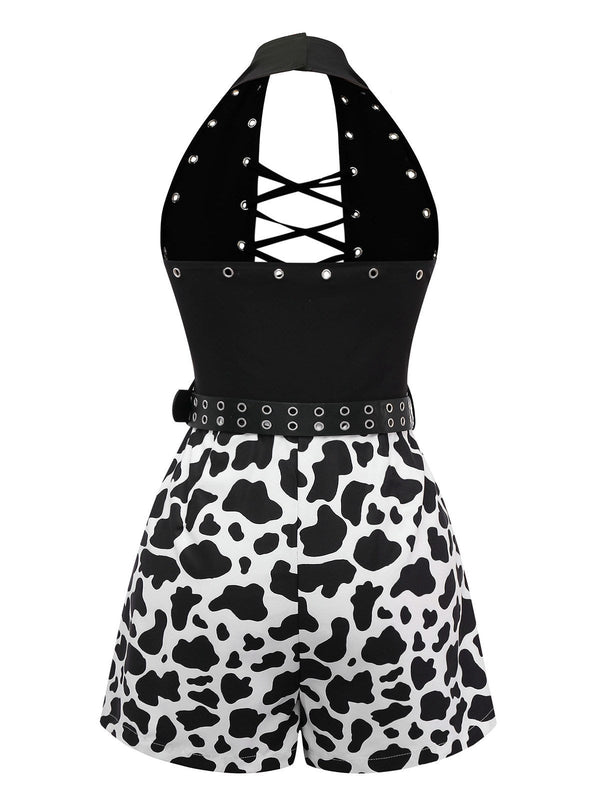 Schwarz 1980er Punk Halter Hohl Kuh-Muster Romper